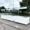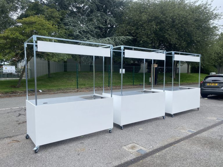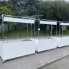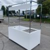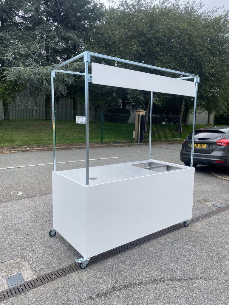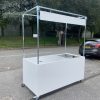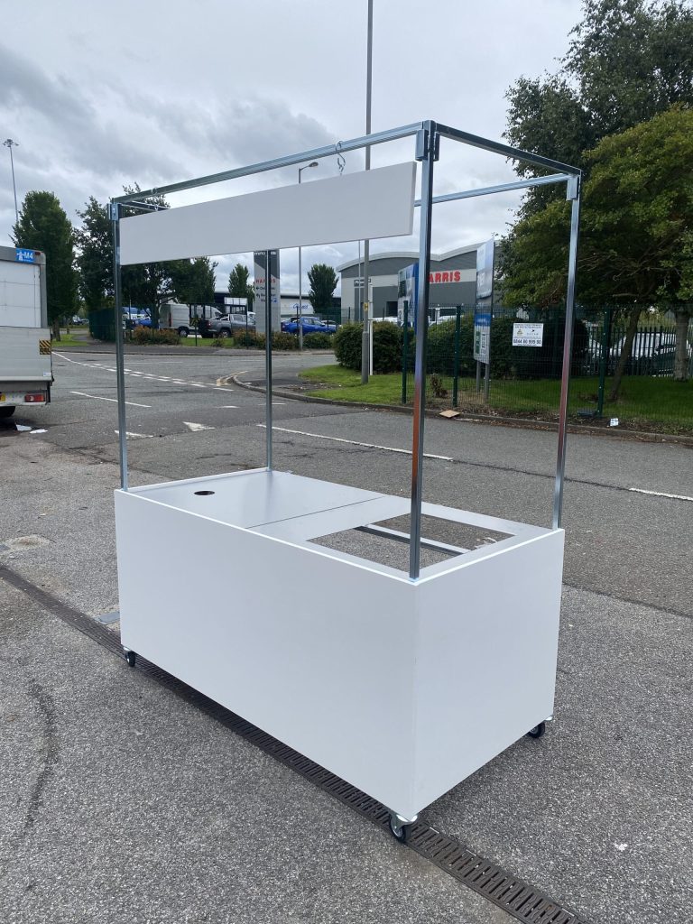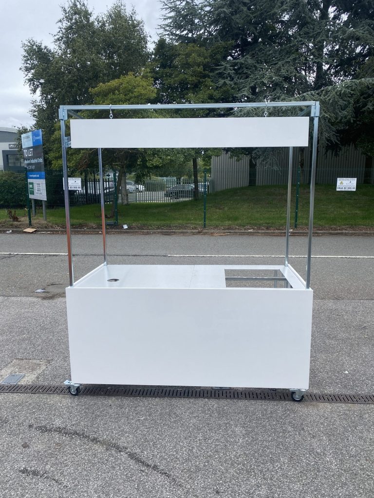 Flat pack mobile cart ready for an event space for the catering team to serve pre cooked food to hundreds of guests. Complete with cut outs for gastronom containers and a holes for till cables.