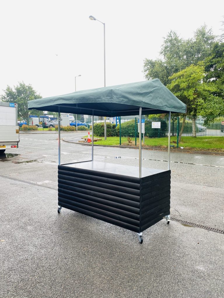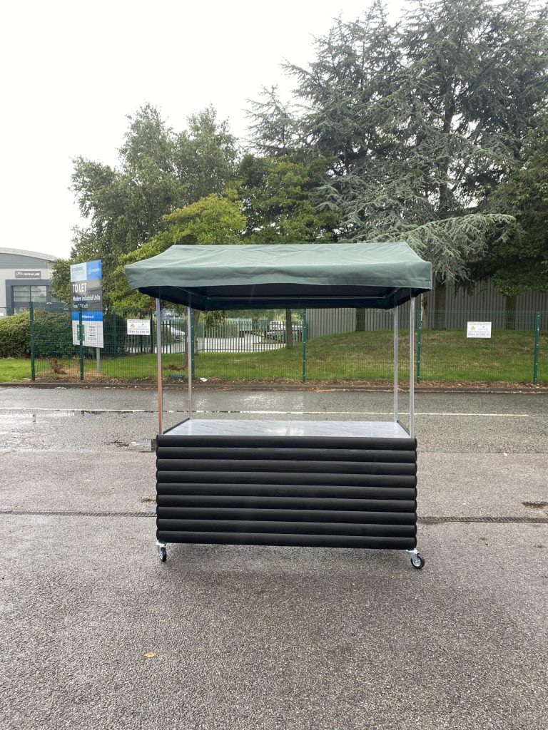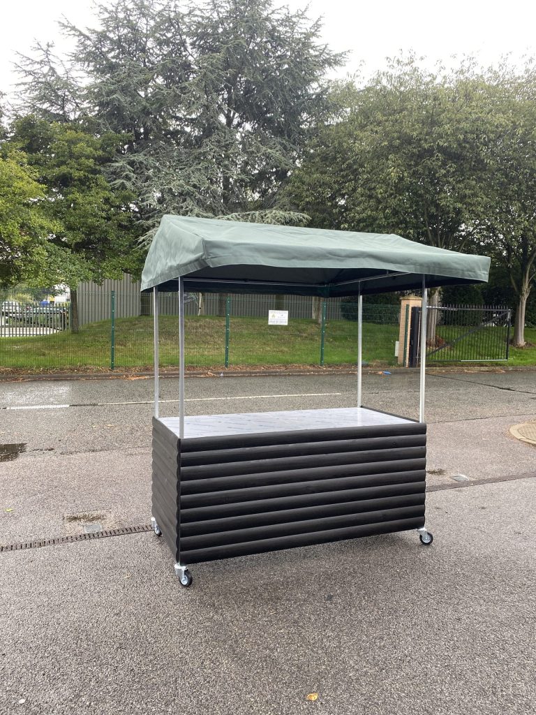 Used as a quick service cart for serving lunch & drinks in school. Signs and menus can be added to the roof , base , side bars.